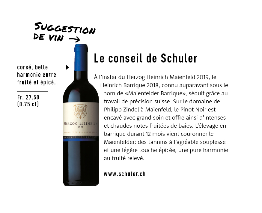 Deux jours: pour choisir le vin le mieux indiqué, c’est plus que suffisant! Gio a déjà commencé les dégustations. Et a été séduit par l’arôme fruité et doux du Pinot Noir «Herzog Heinrich Maienfeld». Avec ses accents de groseilles et de cerises mûres et sa note finale mi-longue, ce vin est, d’après Gio, un élégant accompagnement pour les viandes grillées. Encore une gorgée et Gio est prêt: «Aux fourneaux!».