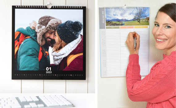 Scegliete la grandezza del calendario e lo stile che più vi piace tra innumerevoli varianti. Nei formati da A4 a A3, quadrati o pieghevoli, per gli appuntamenti o come agenda. Le famiglie apprezzeranno i nostri calendari settimanali, che offrono molto spazio per le attività di tutti i membri della famiglia, mentre il grande calendario formato A3 piacerà a tutti. Se pensate di passare troppo tempo davanti allo schermo, sostituite il cellulare con un’agenda disponibile anche con rilegatura in lino o pelle.