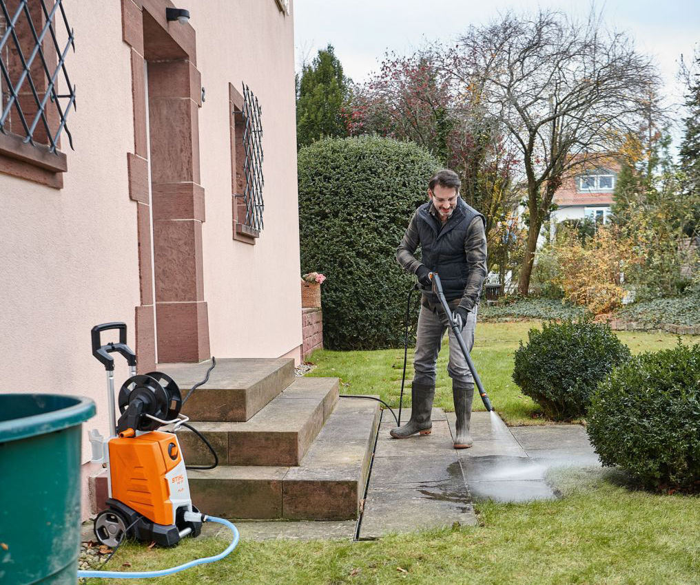Le idropulitrici ad alta pressione come la RE 130 PLUS di STIHL aiutano a rimuovere lo sporco invernale dalla superficie della terrazza, dai vialetti del giardino o dai mobili da esterno.