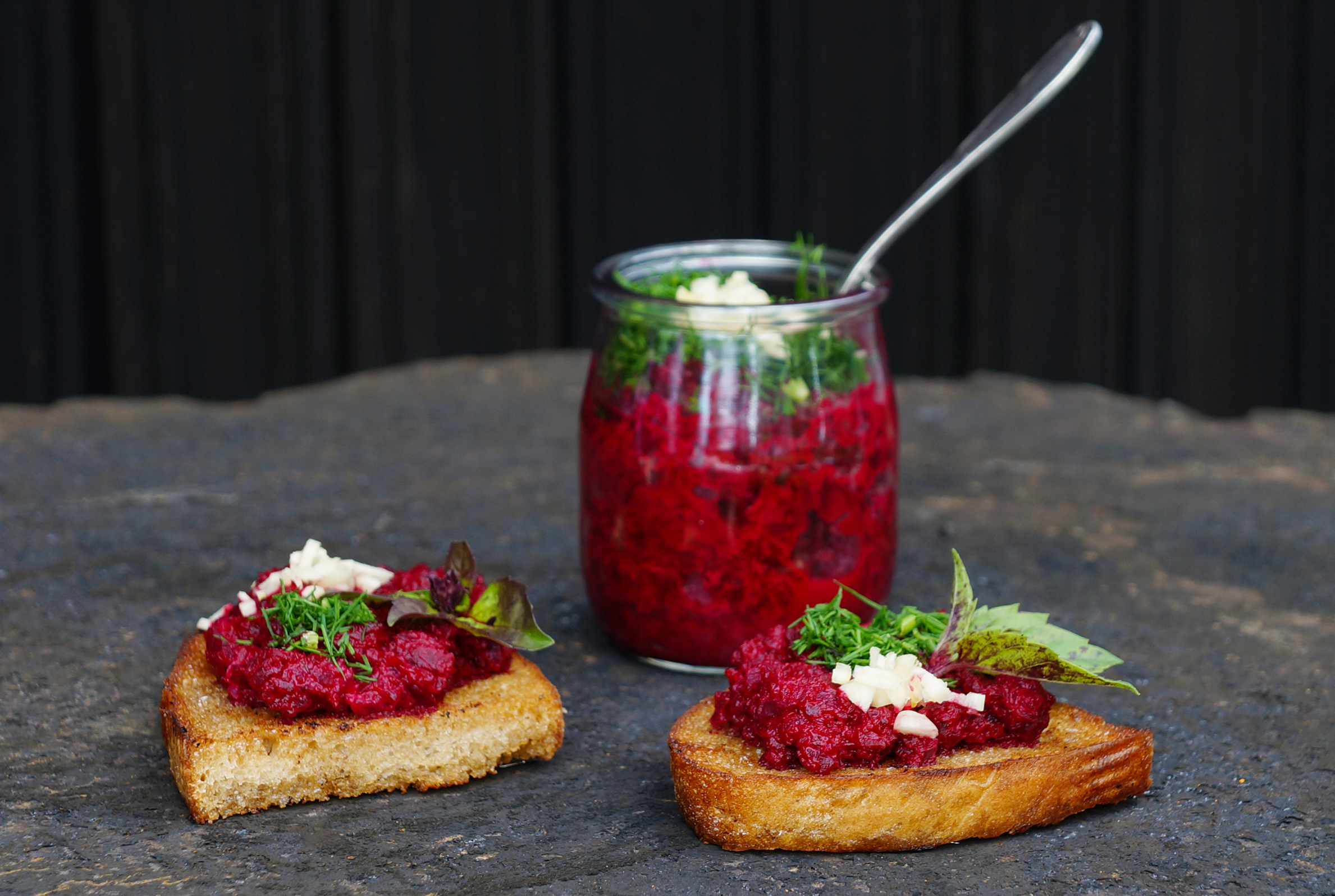 Als Brot-Aufstrich ist fermentierte Rote Bete nicht nur sehr bekömmlich, sondern auch äusserst schmackhaft. Das folgende Grundrezept kann durch Zutaten wie Kressesamen, frischen Koriander, Kapern, Peperoni, Walnüssen, Meerrettich oder Cumin ganz nach Belieben verfeinert werden. Ein veganer Gaumenschmaus, der durch seine knallige Farbe ein echter Hingucker auf dem Buffet ist.