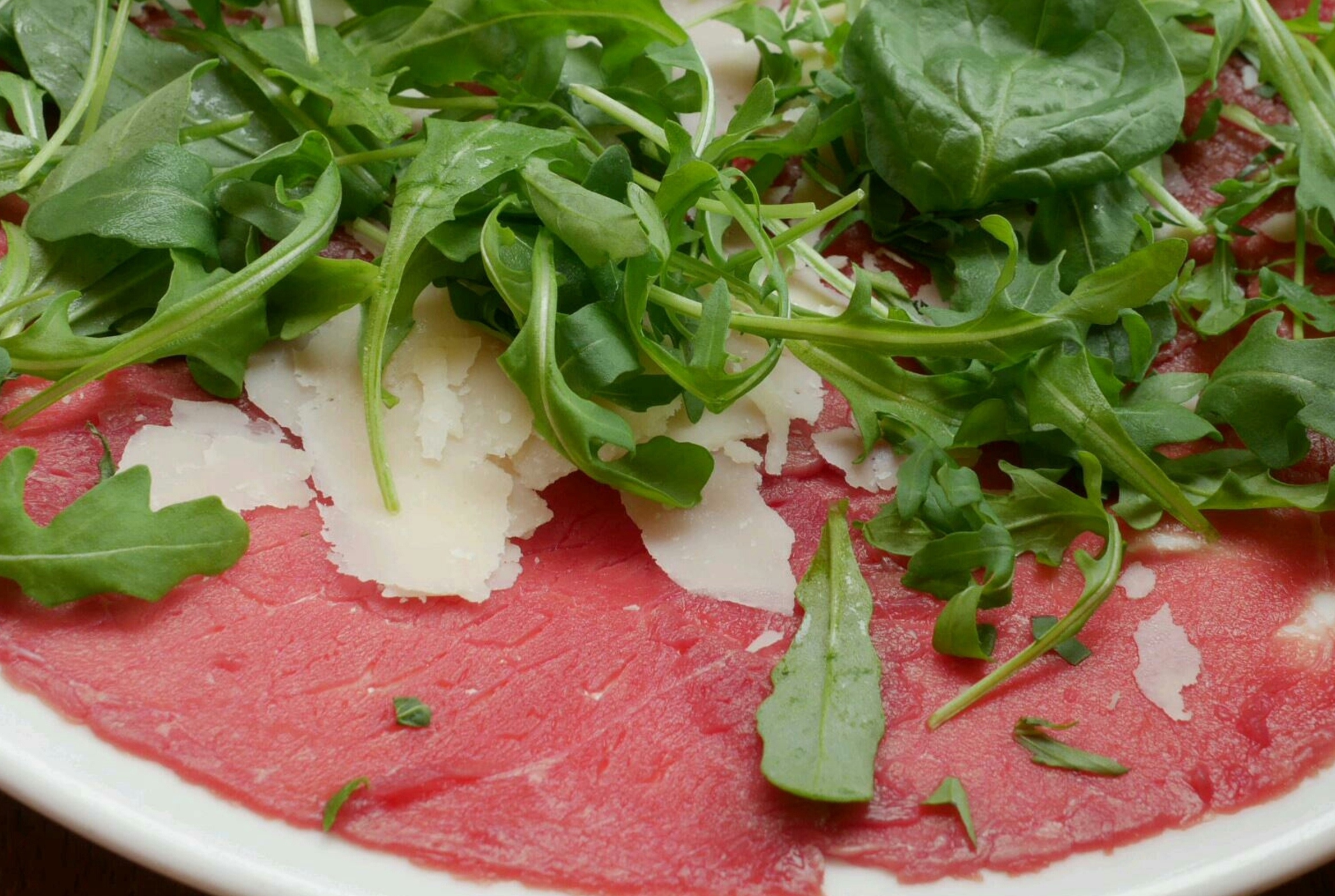 Das Carpaccio anrichten; mit Pfeffer und Parmesan bestreuen sowie dem Meersalz würzen.