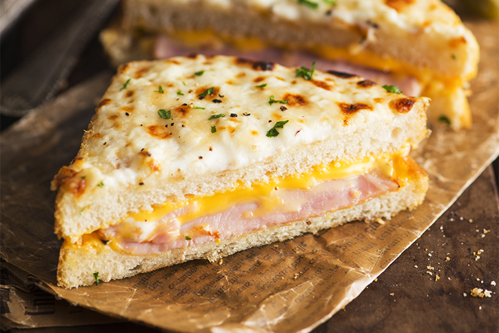 Einfach, aber besonders raffiniert ist der Croque Monsieur, was so viel wie «knuspriger Herr» bedeutet. Ursprünglich im frühen 20. Jahrhundert in Pariser Cafés entstanden, entwickelte sich die Sandwich-Variante schnell zu einem beliebten Gericht in ganz Frankreich. Traditionell werden zwei Brioche- oder Toastbrotscheiben mit Béchamelsauce bestrichen und dann mit gekochtem Schinken und Käse – meist Emmentaler oder Gruyère – belegt. Um seinem Namen gerecht zu werden, wird das Sandwich dann nochmals mit Béchamelsauce bestrichen oder mit Käse bestreut und dann im Ofen knusprig überbacken. Wird nach dem Backen noch ein Spiegelei auf das Sandwich gegeben, ist aus dem Croque Monsieur im Nu eine Croque Madame geworden.