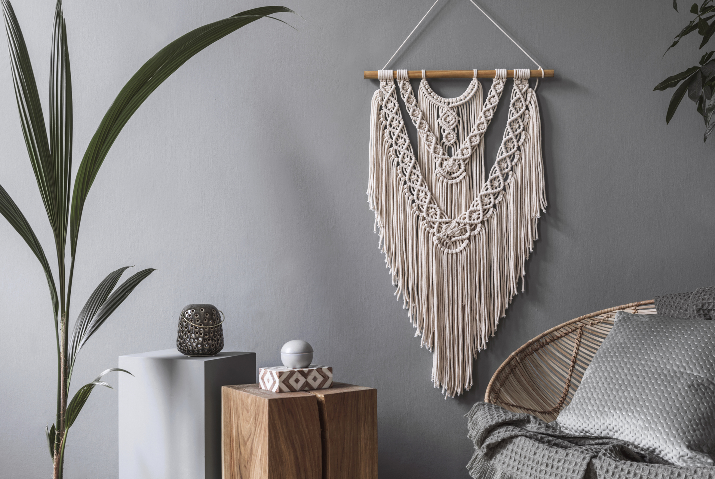 Makramees sind gerade total angesagt und ganz vorne mit dabei, wenn es um beliebte Einrichtungstrends geht. Mit unseren vier Tipps sorgen die geknüpften Muster in schlichten Farben auch in Ihrem Zuhause für eine hübsche Abwechslung an der Wand.