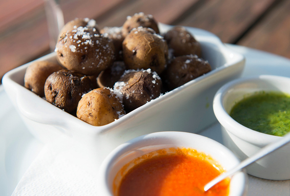 Lavare bene le patate e metterle in una pentola riempita per metà d‘acqua. Aggiungere il sale e mettere un panno ripiegato tra il bordo della pentola e il coperchio. Far cuocere le patate per 20 minuti fino a che l‘acqua è evaporata e far asciugare a fiamma bassissima. Ogni tanto scuotere la pentola per evitare che le patate si brucino.