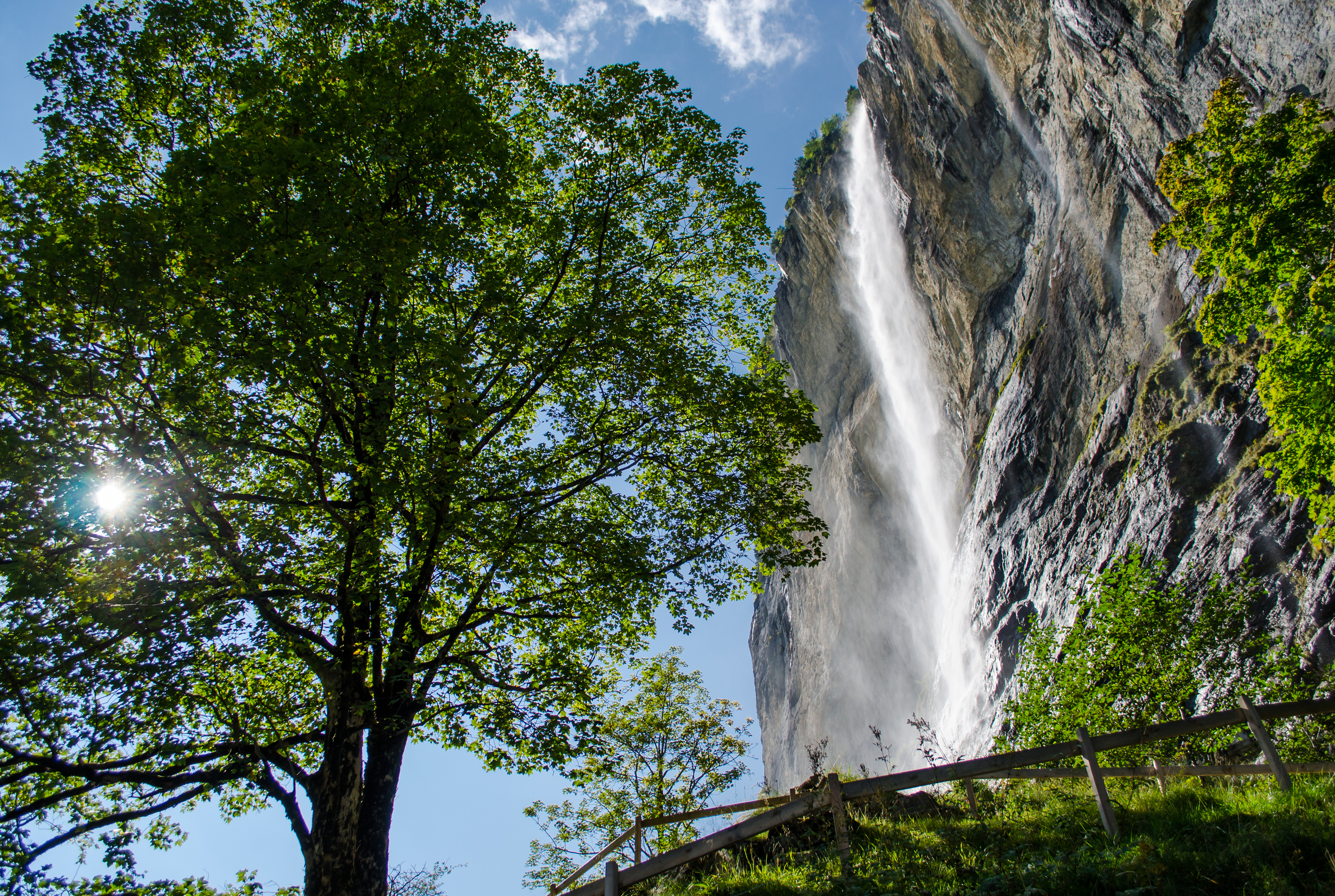 Während der Rheinfall bei Schaffhausen ein Erlebnis ist, das sich gut in einem halben Tag geniessen lässt, planen die Freunde für den nächsten Trip ein ganzes Wochenende ein. Diese Wasserfall-Reise führt zuerst nach Lauterbrunnen im Kanton Bern. Von senkrechten Felswänden links und rechts stürzen hier unzählige feine Kaskaden ins Tal. Dieser Ort wird auch Tal der Wasserfälle genannt. 72 sind es insgesamt. Imposant sind sie alle. Der berühmteste unter ihnen ist der Staubbachfall. Knapp 300 Meter hoch ist die Felswand, über die der Staubbach stürzt. Im Sommer zerstäuben Aufwinde das fallende Wasser in alle Richtungen. Der Wasserfall ist eine einzige Tröpfchenwolke. Das macht ihn mit zum schönsten der Schweiz – einzigartige Fotos garantiert. Vom Dorf aus führt ein kleiner Weg zum Fusse des Wasserfalls, den Reto und sein Kollege nehmen. Am Eingang der Felsengalerie ziehen sie ihre wasserfesten Outdoorjacken über, es wird merklich kühler, als sie hinter den Wasservorhang treten. Zudem ist eine nasse Erfrischung inklusive.